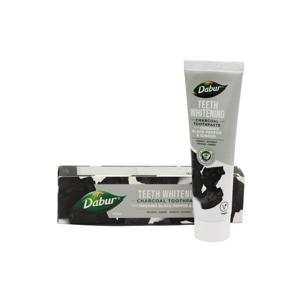 Kořeněná zubní pasta Dabur s aktivním uhlím a bělicím účinkem. Veganská s organickým pepřem a zázvorem, bez fluoridu. S vylepšenou recepturou! Ingredients: aqua, sorbitol, silica, PEG-32, sodium coco-sulfate, aroma (flavor), xanthan gum, tetrasodium pyrophosphate, charcoal powder (černé uhlí), extrakt z černého pepře (piper nigrum fruit extract), extrakt z dlouhého pepře (piper longum fruit extract), extrakt kořene zázvoru (zingiber officinale root extract), olej ze žlutodřevu křídlatého (zanthoxylum alatum fruit oil), sodium saccharin, trisodium phosphate, tetrapotassium pyrophosphate, mica, benzyl alcohol, eugenol, CI 77891 (titanium dioxide) Skladování: Uchovávejte v suchu a chladu z dosahu slunečního záření a silných aromat. Objem: 100 ml Země původu: Spojené Arabské EmirátyDoplňkové parametry