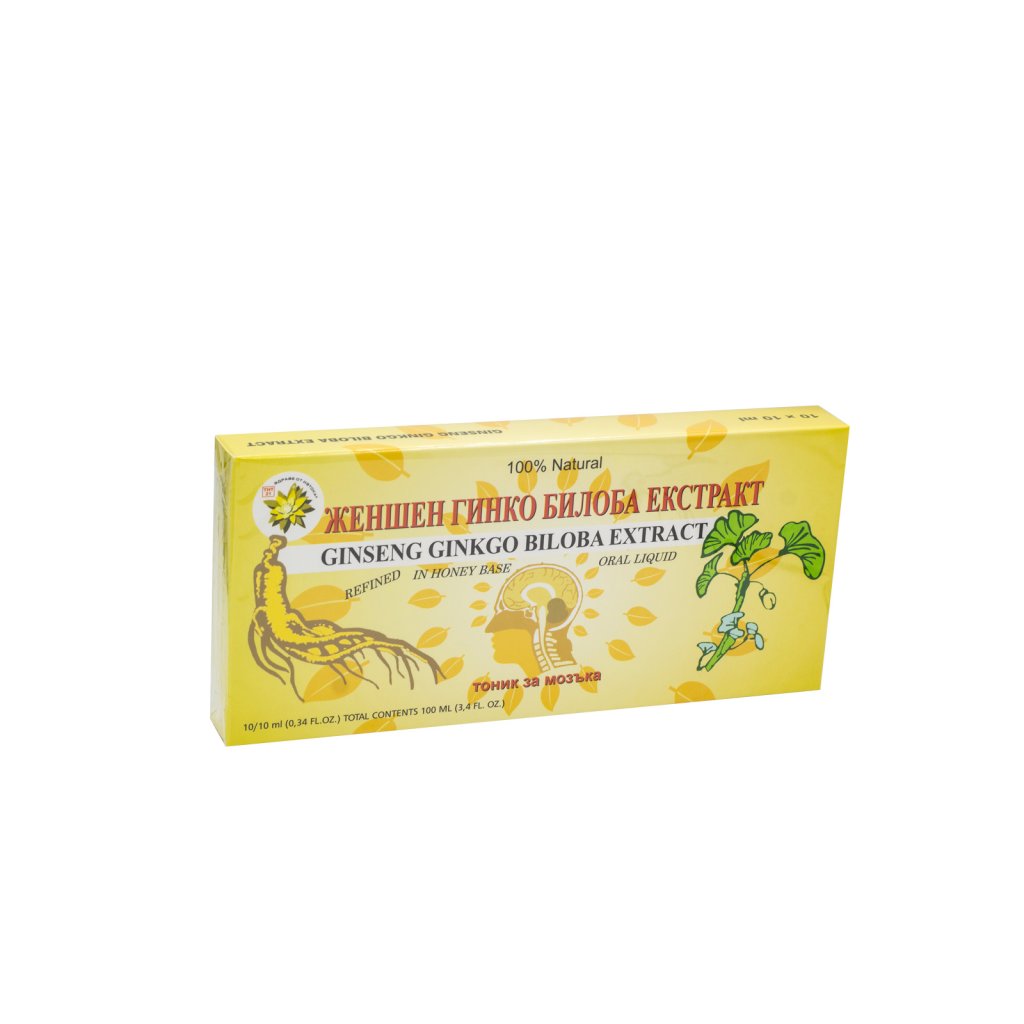 Užívání: Obsah ampule pečlivě rozmíchejte ve vodě nebo čaji a vypijte. Případně lze vysát extrakt přiloženým brčkem přímo z ampule.Dávkování: 1 – 2 ampule denně mezi jídlySložení přípravku (na 10 ml): extrakt z jinanu dvoulaločného (Ginkgo biloba) 3000 mg (50:1), čistý extrakt z kořene ženšenu (Panax ginseng) 400 mg (10:1), včelí med, destilovaná voda, ethanol jako konzervant méně než 0,5 %Obsah balení: 10 skleněných ampulí po 10 ml (celkem 100 ml)Upozornění: Uchovávejte mimo dosah dětí. Výrobek není určen pro děti do 14 let, těhotné ženy a jako náhrada pestré stravy. Není vhodný pro osoby přecitlivělé na včelí produkty aj. potravinové alergie. Nepřekračujte doporučené denní dávkování.Skladování: Skladujte v suchu a temnu při teplotě nižší než 25 °C.Obsah balení: 10 skleněných ampulí po 10 ml (celkem 100 ml)Země původu: ČínaDoplňkové parametry